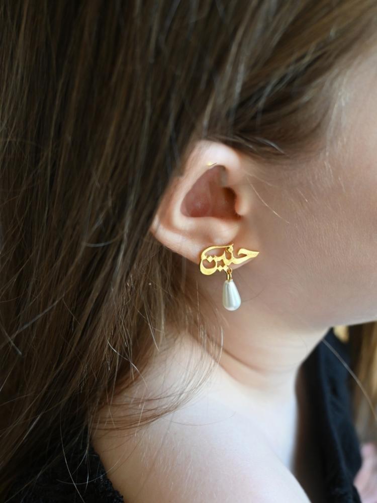 اجمل إهداء لمن تحبون بالاسم 😍تفاصيل المنتج:عدد القطع 2حلق للاذنين.متوفر باللونين ذهبي او فضي.طلاء ذهب عيار 21.مضمون مايتغير لونه.تاتيكم بتغليف شيك وجميل.