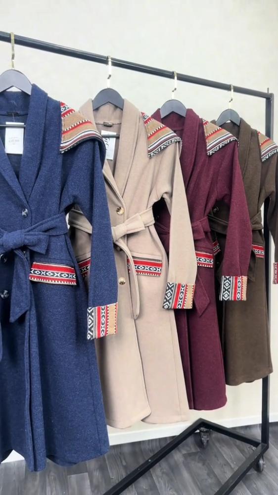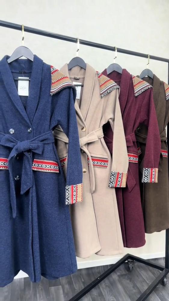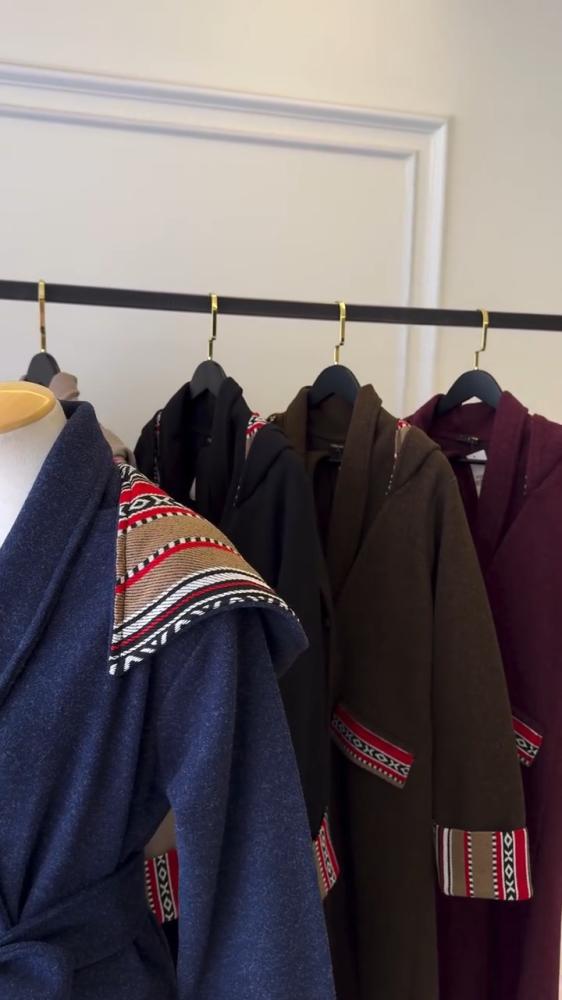 معطف نسائي شتوي فاخر بقصة ميدي أنيقة، مصنوع من قماش جوخ ثقيل ودافئ باللون . يتميز هذا المعطف بتصميم عصري يدمج ببراعة عناصر مستوحاة من التراث. الزخارف تظهر بشكل لافت على طول حافة غطاء الرأس (الهودي)، وعلى الأساور العريضة للأكمام، وفي منتصف حزام الخصر، وتأتي بنقوش هندسية متناغمة بألوان حيوية كالأبيض والأحمر والأسود، مما يضفي عليه طابعاً فريداً ومميزاً. مزود بحزام قماش للربط عند الخصر لتحديد القوام وإضفاء لمسة أنثوية، كما يحتوي على أزرار مخفية جزئياً. إنه الخيار الأمثل لمن تبحث عن معطف يجمع بين الدفء، الجودة العالية، والتفرد في التصميم لمواسم الشتاء والخريف.